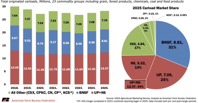 Omaha-based Union Pacific’s proposed $85 billion merger with the Norfolk Southern is being questioned by the American Farm Bureau Federation (AFBF) as to whether it’s in the best interests of farmers and ranchers. “The Great Connection,” as called by the Union Pacific, would create the nation’s first transcontinental railroad, connecting 50,000 route miles in 43 states, 10 international interchanges, and 100+ ports. Railroads are vital for the transportation of agricultural commodities, inputs, and food products. According to the AFBF, farm and food products account for roughly 20% of total U.S. rail tonnage. “In 2023 alone, U.S. railroads carried more than 80 million tons of corn, 26 million tons of soybeans, and nearly 26 million tons of wheat, much of it originating in the Midwest and Northern Plains and moving toward coastal ports or major processing hubs,” said the AFBF.