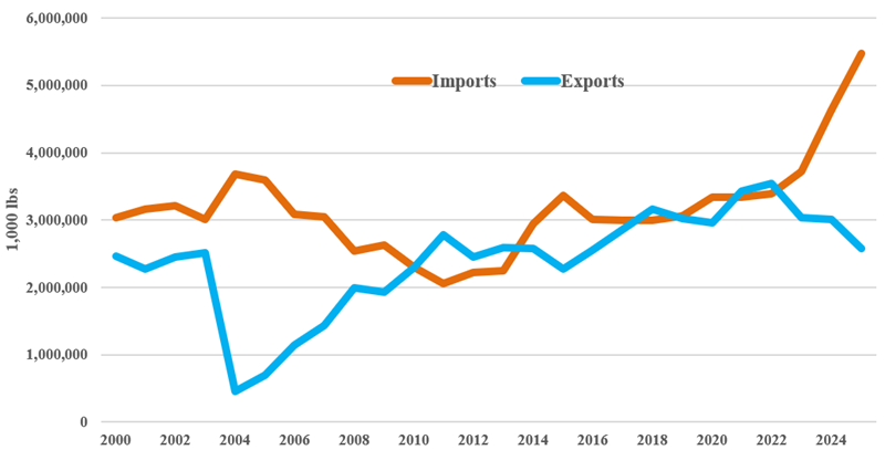 Figure 2. U.S. Imports/Exports of Beef, 2000-2025 (1,000 lbs.)