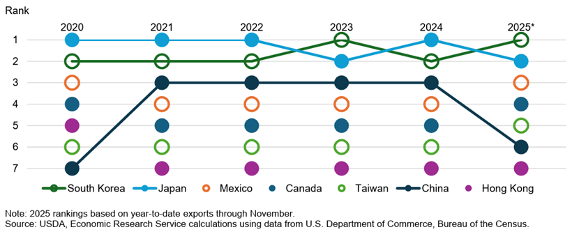 Purchasers of U.S. beef last year were led by South Korea with 627 million pounds, Japan at 608 million pounds, and Mexico with 298 million pounds. But despite the impressive volumes, shipments to the top six markets were off compared to 2024, with the biggest drop seen in China. China fell from being the third-largest market in 2024 to the sixth-largest last year. Shipments to China were off 67%, or 320 million pounds. The fall was due to trade frictions between the U.S. and China and the non-renewal of export registrations by China for U.S. suppliers.