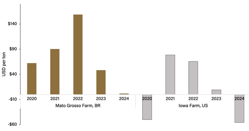 Figure 1 shows the economic profits for the representative farms during the period. As can be seen, profits on Brazilian farm outperformed those on the U.S. farm. Colussi and Langemeier note, “Although Brazil had significant cost increases between 2021 and 2022, strong soybean prices, local currency depreciation, and robust export demand helped sustain profitability during that period. Meanwhile, U.S. soybean production generated strong margins in 2021 and 2022 but faced tighter or negative margins in other years, reflecting rising operating costs, high fixed land expenses, and sensitivity to market price fluctuations.”