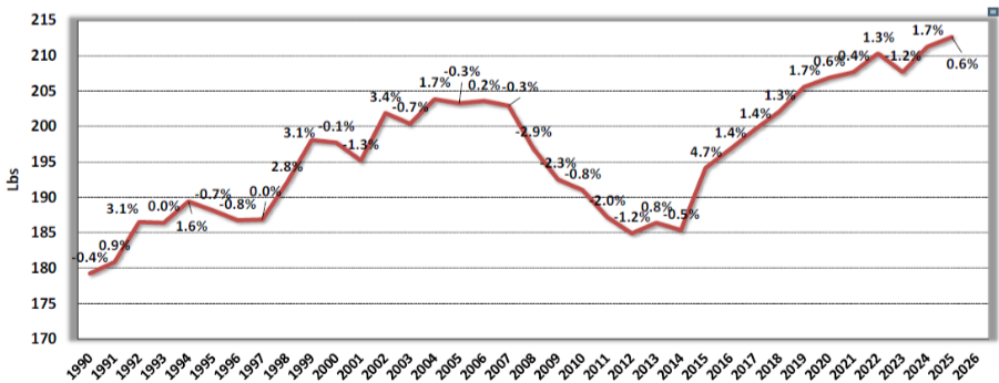 Figure 5. Per-Person Meat Supplies (Beef, Pork, & Chicken)
