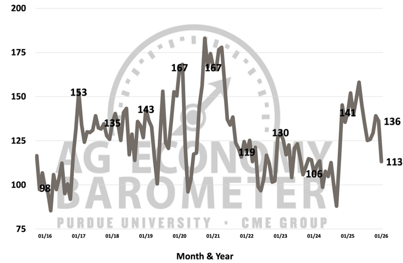 The latest farmer sentiment reading from the Purdue University-CME Group Ag Economy Barometer Index showed producer sentiment is weakening. The index, based on producer surveys, fell 23 points in January to 113, off considerably from a barometer exceeding 150 in mid-2025. For context, the highest-ever barometer recorded was just above 175 in late 2020 into early 2021. At the other end of the spectrum, the index dropped below 100 in 2016 and again in late 2024. Agricultural economists at Purdue said producers “reported worsening financial conditions compared to a year ago, with half indicating operations were worse off.” Thirty percent of producers surveyed expected weaker financial performance in the next 12 months. Only 20% expected improvement. Rising debt and slow U.S. agricultural exports were mentioned as concerns.