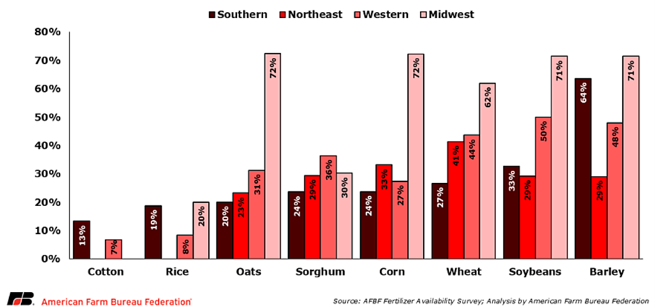 According to the AFBF survey, roughly two-thirds of farmers in the Midwest, including Nebraska and the Corn Belt, pre-booked fertilizer for this year. In contrast, only 19% of farmers in the South pre-booked, 30% in the Northeast Region, and 31% in the Western Region. Differences in forward purchases of fertilizer were also found between commodities produced. AFBF found, “Nearly half of soybean producers reported pre-booking fertilizer (49%), followed by barley (47%), corn (44%), and wheat (42%) growers.” And the surveys showed, “Lower pre-booking rates among cotton (13%) and peanuts (9%).” There were regional differences among producers within commodities too. Midwest producers of corn, oats, wheat, soybeans, and barley far outpaced fellow producers in other regions in pre-booking fertilizer.