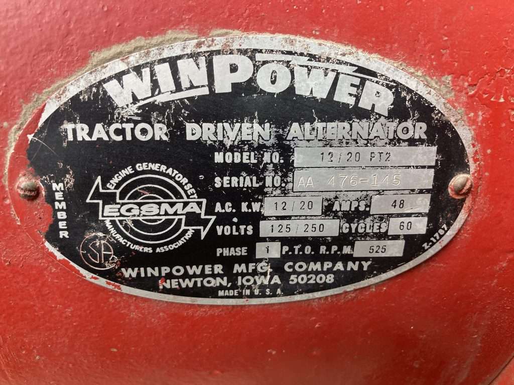 WinPower 12/20 PTO generator. 540 RPM, single phase, on cart.